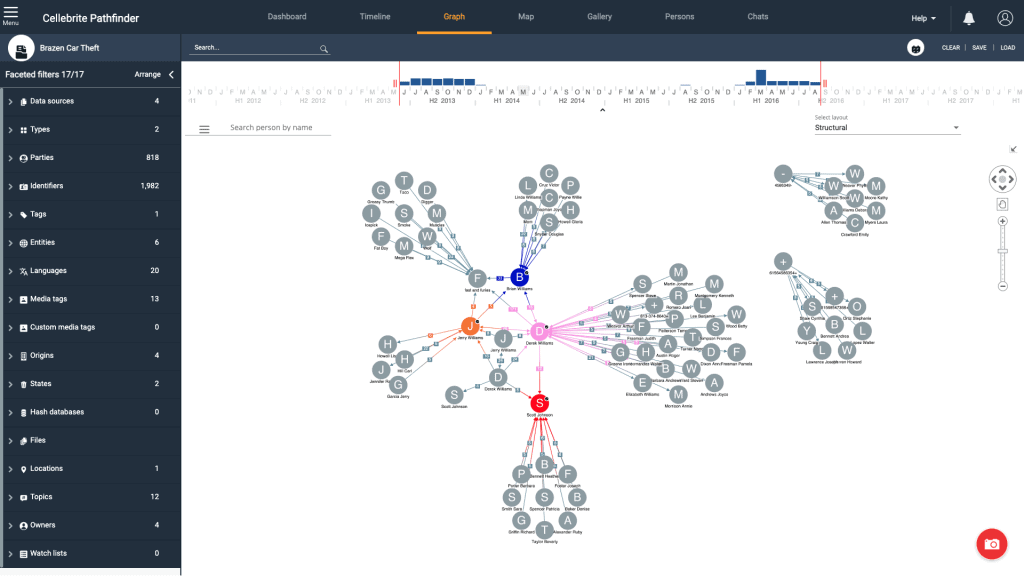Cellebrite Analytics tự động phát hiện và hiển thị các khuôn mặt bên trong các phương tiện media. Bạn có thể nhanh chóng và dễ dàng tìm kiếm các hình ảnh có khuôn mặt giống như trong hình ảnh đã xem xét, tiếp tục hiển thị các đối tượng tiềm năng và mở rộng điều tra bằng cách tạo kết nối tự động giữa các phương tiện truyền thông dựa trên những người nằm trong mối quan tâm.